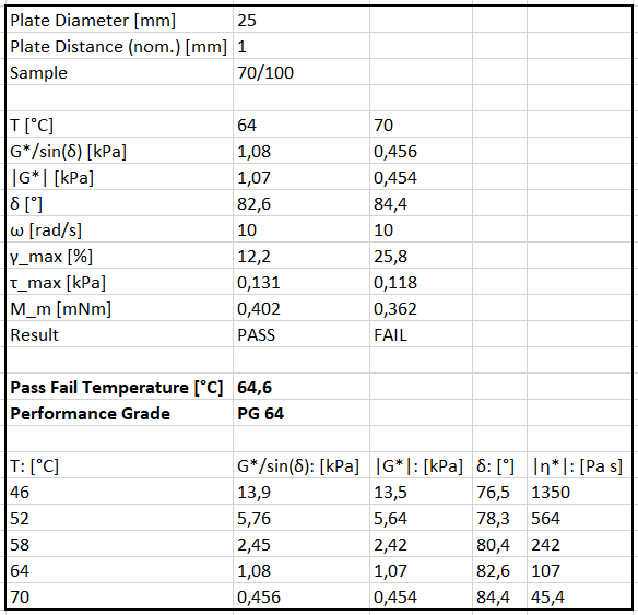 Зліва наведено випробування незістареного бітуму Orlen 70/100, який згідно отриманих результатів відповідає PG 64 за системо Superpave. Cправа – Orlen 70/100 модифікований полімером (CБС), який відповідає PG 70.
