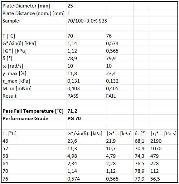 - Показник стійкості до колійності (rutting factor) G*/sinδ [кПa]. Випробовуються бітуми до та після RTFOT (короткотривалого старіння). Температура підбирається так, щоб показник G∗/sinδ відповідав мінімальним вимогам Superpave – ≥ 1,0 кПа для незістареного бітуму та ≥ 2,2 кПа бітуму після RTFOT. Це дозволяє визначити високотемпературний клас PG, при якому бітум забезпечує необхідну стійкість до колійності.